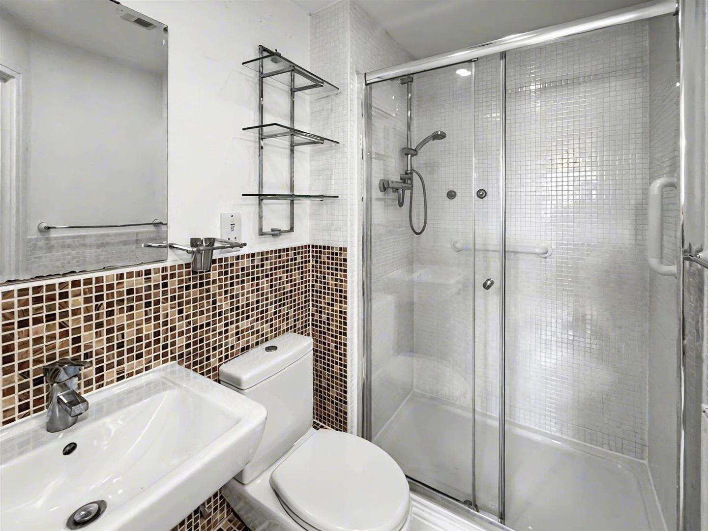 With white suite comprising WC, wash hand basin and double shower cubicle.