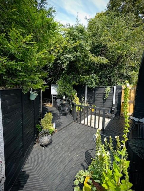 Decked area to side with hot tub.